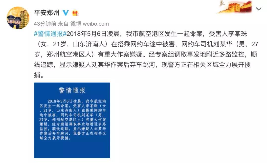郑州警方10日晚通报称,网约车司机刘某华(男,27岁,郑州航空港区人)有重大作案嫌疑。经专案组调取事发地附近多路监控,顺线追踪,显示嫌疑人刘某华作案后弃车跳河,现警方正在相关区域全力展开搜捕。