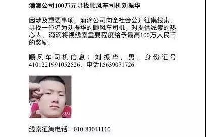 此外,滴滴公司向全社会公开征集线索,寻找嫌疑司机(名为刘振华的顺风车司机)。对提供线索的热心人,滴滴将视线索重要程度给予最高100万人民币的奖励。